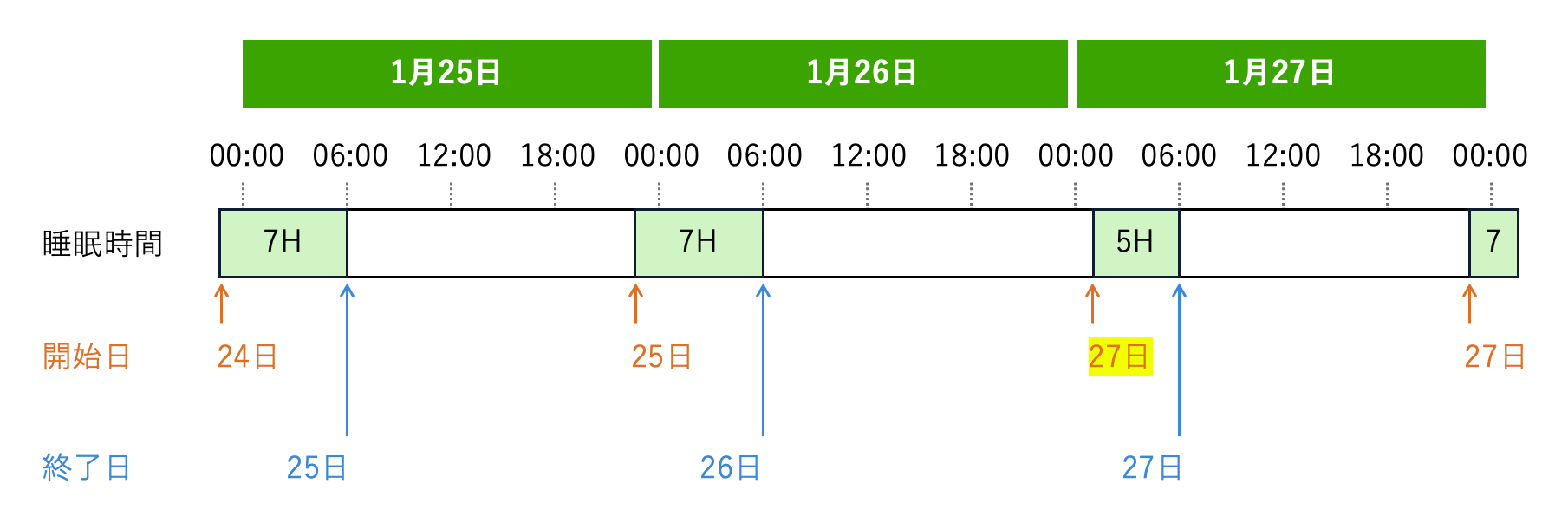 例えば、普段11時に就寝している人が、1月26日の深夜に作業に没頭し、翌27日の1時まで起きていたとします。 開始時刻を基準に日付を紐づけると、26日の合計睡眠時間が極端に短く、翌27日の睡眠時間が極端に長くなってしまいます。 これを解決するため、終了時刻を基準に日付を設定することにしました[1]。
