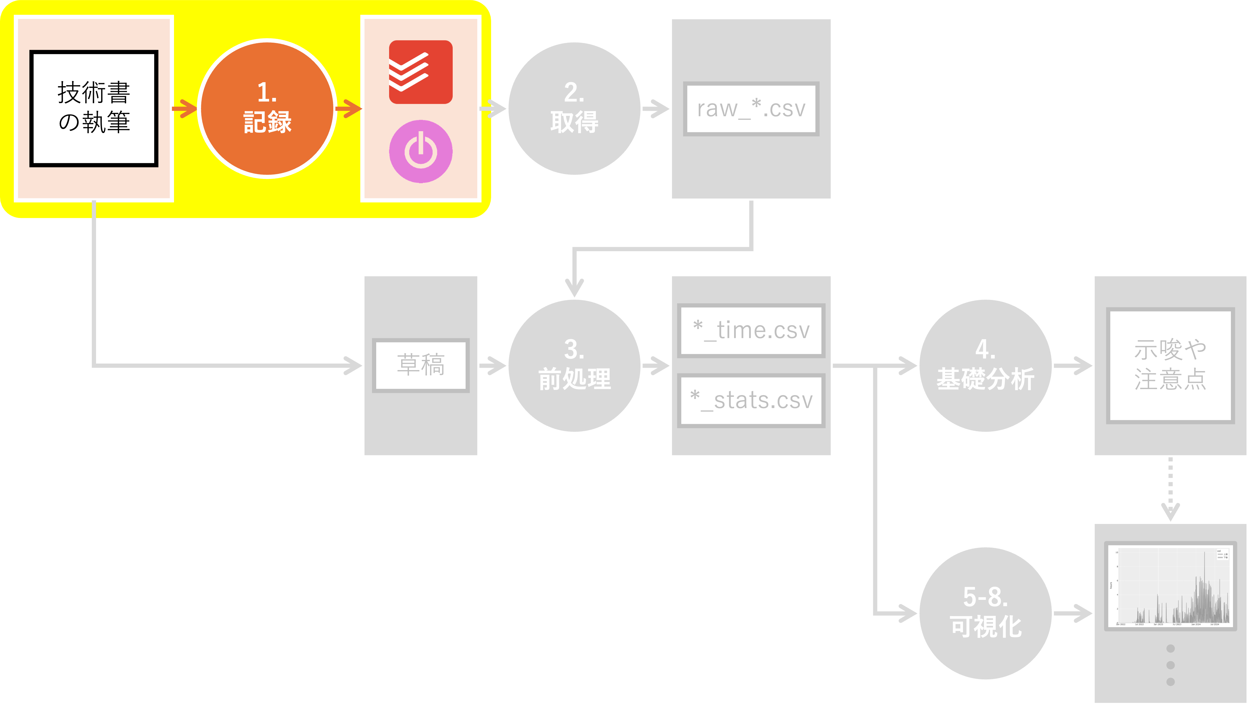 このように、一つ一つの作業時間を記録しました。 可能な限り実態に近づけるため、 トイレ休憩等のたびに計測を止めています [4]。