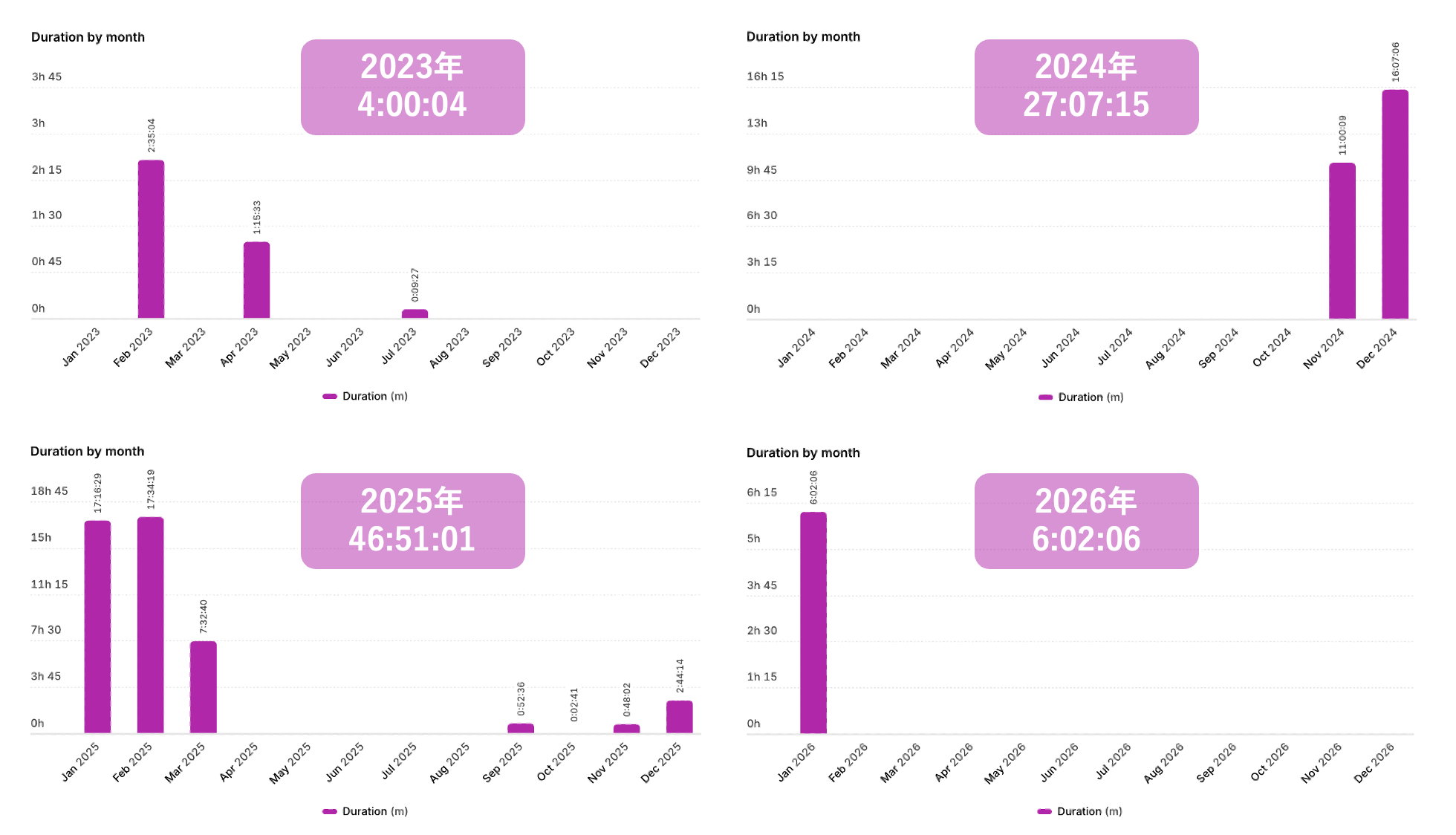 と同時に、まとまった作業時間を確保することの重要性も明らかになりました。 年別の作業時間内訳を見ると、2024年になって30分以上の作業時間が飛躍的に増加しています。 この時期に本書の多くの部分が完成したことを考えると、「小さく前進し続ける」戦略と「集中的に進める」戦略の両輪で回すことがポイントだったのかもしれません。 改めて、作業環境を支えてくれた家族には心から感謝しています。 特に妻の理解と支援がなければ、この本が完成することはありませんでした。
